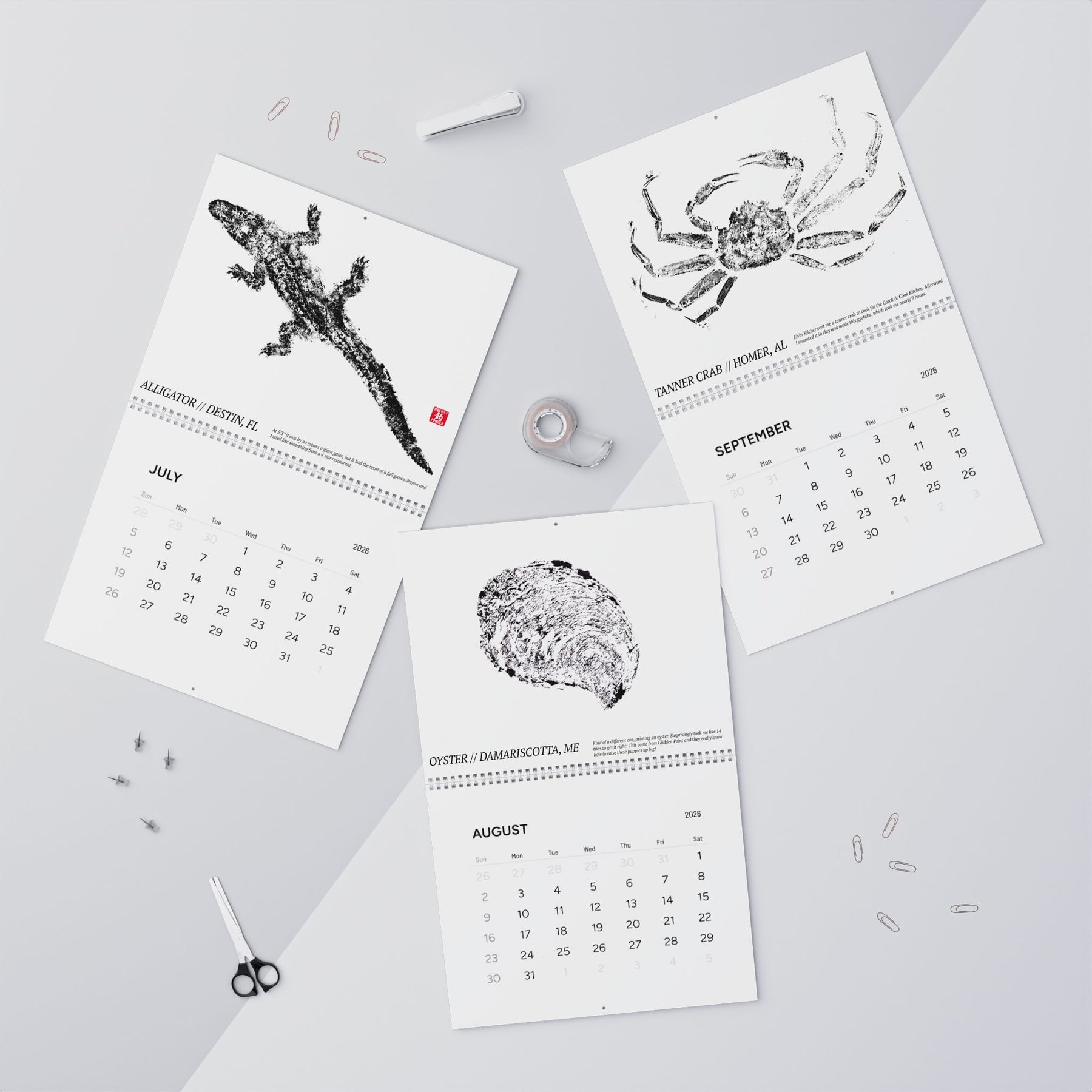 Follow Fowler's gyotaku fish print journey through his second year with the art form. Each month comes with a story about the design and video the print is from. The calendar itself comes with a spiral binding and a centered hole for wall hanging. Each month features a large, detailed black-and-white illustration of a fish or crustacean rendered with fine ink textures. Flip through the months on sturdy wire coils; hang it anywhere with the centered hole for an instant tidying of your wall space.